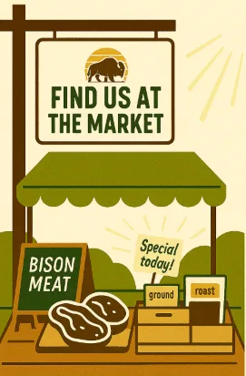 Each week, we bring a selection of our pasture-raised bison, from ground and steaks to roasts and burgers, along with recipe ideas and friendly conversation. As we grow, we plan to be at more markets and special events — so stay tuned!
